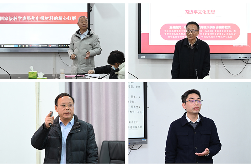 龙兵以《国家级教学成果奖的培育、凝练与申报》为题,从国家级教学成果的顶层设计、工作积累、材料打磨等方面详细阐述国家级教学成果如何规划、如何行动、如何凝练的思路与做法。张国祚以习近平文化思想为题,聚焦“六个必须坚持”深刻剖析了习近平文化思想的原创性贡献。尹世尤以《习近平新时代中国特色社会主义思想的若干问题》为题,对习近平新时代中国特色社会主义思想中“以中国式现代化全面推进中华民族伟大复兴”“文化自信”等重大问题如何开展教学进行了分享。陶应时结合自身科研经验,为思政课教师提供了国家社科基金项目申报的方法论。