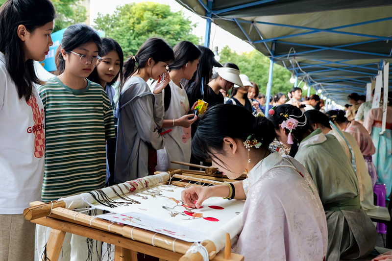 劈线、穿针,运用混针对作品进行混色调整。在湘绣技艺展示现场,一幅山水刺绣作品正在紧锣密鼓的进行绣制。四名刺绣专业的学生身着汉服,创作着不同题材的湘绣作品,她们手中的针线在面料上穿梭,丰富的色彩层次分明,栩栩如生的图案活灵活现,展现出湘绣技艺的精湛细腻,让现场观众感受到了中华优秀传统文化的博大精深与独特魅力,令人叹为观止。