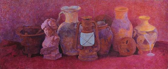 《带石膏头像的静物》113x47cm,2019年 水粉