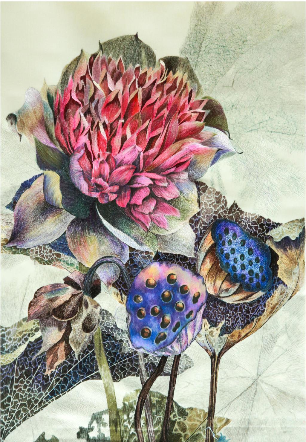 设计说明:作品以水彩画为题材,主要运用传统针法掺针、 游针、混针、齐边针等针法进行刺绣表现,展示了荷不同时期生命的不同形态,将作品中花苞、荷叶、莲蓬等表现的精致细腻。整幅作品纹理突出,肌理层次感强,充满了浪漫的生活气息,准确的再现了湘绣对“以针代笔、以线润色”的刺绣艺术语言的独特表现力。
