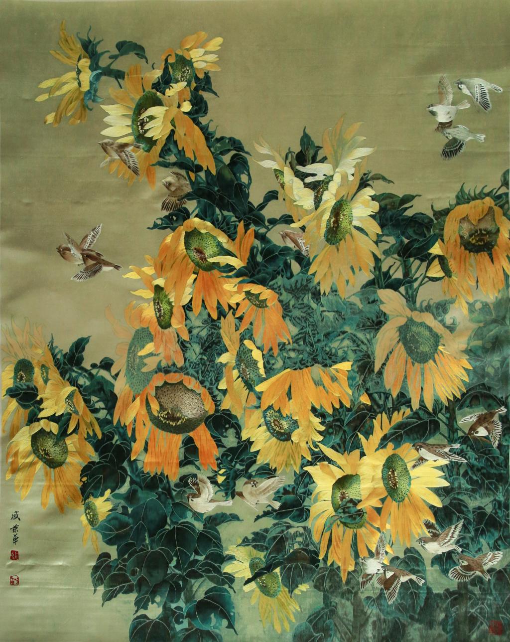 设计说明:作作品以水彩画为题材,画面中虚实有度,色彩清新自然,不艳不俗,可谓欣赏之佳作。绣制中使用了50多种不同色阶黄色的丝线,绣制向日葵花盘采用了独特的盘旋针、交叉针混合绣制,根据花盘颜色的深浅、形态特点随意走针,清晰明了的表现出花盘独特的肌理质感,绣制出来的花盘就像粒粒饱满的葵花籽,形态各异、生动有趣、逼真耐看。