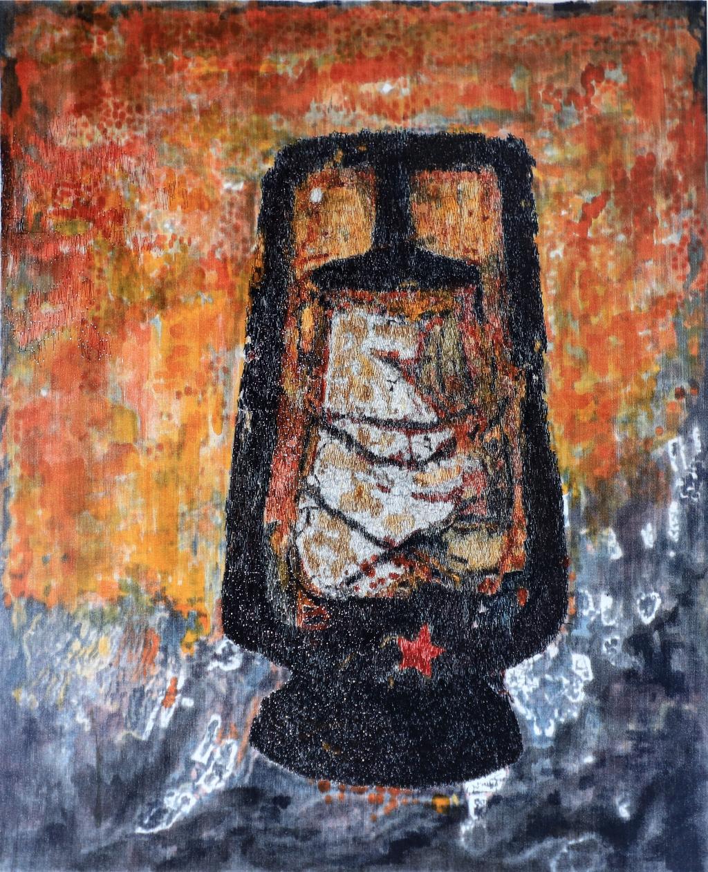 设计说明:绣稿选取辛立刚的漆画系列作品《马灯一》为刺绣蓝本。原作选用油画颜料、鸡蛋壳、油漆进行绘制,为体现画面的肌理效果,运用了多种交叉针的形式表现出饱经沧桑的美,散发着浓厚的生活气息与怀旧风情,让人不经回忆往昔的故事,传递给我们无限的红色正能量。