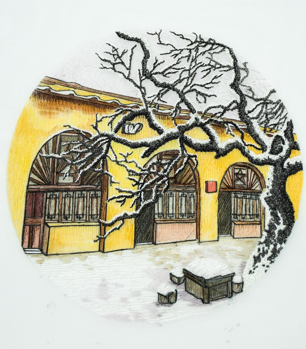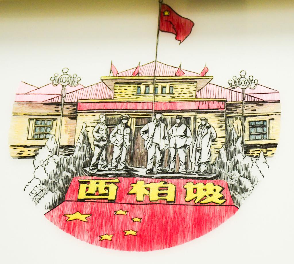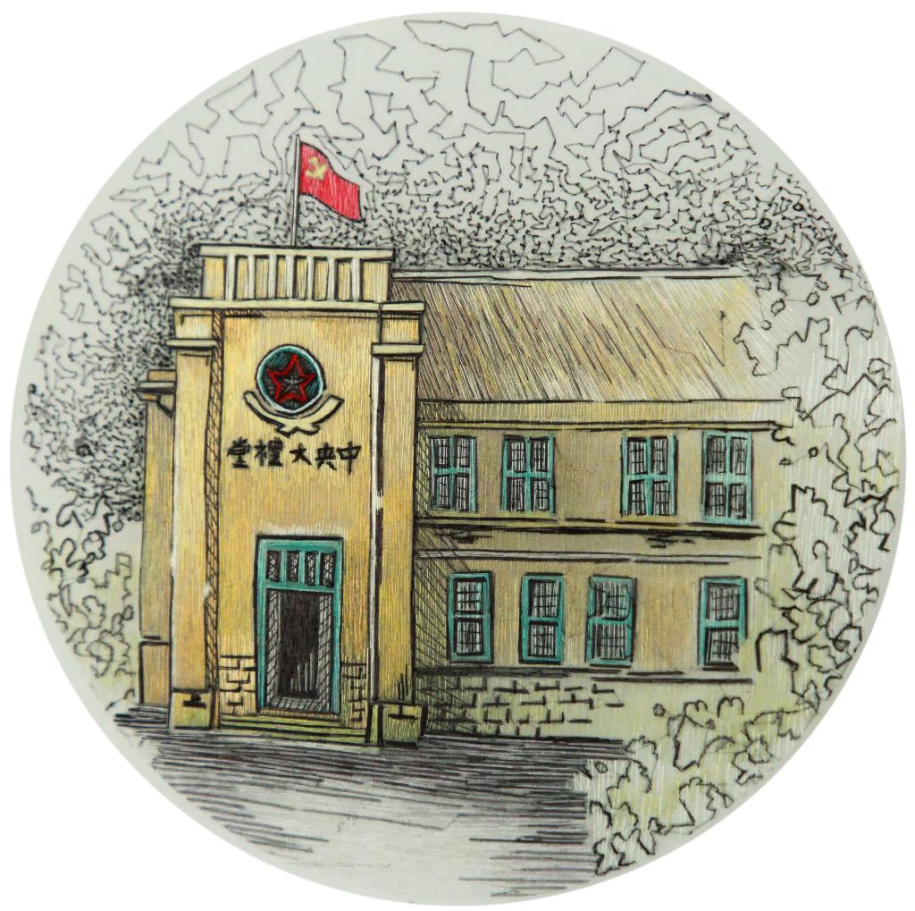 设计说明:作品以速写淡彩画为题材,画面中建筑物灵活的运用了掺针、齐边针等针法结合丝线的粗细来进行绣制,人物巧妙的运用了柳针来进行细致的刻画,整幅作品既代表了中国红色革命精神,也呈现时代精神与艺术创作的完美结合。