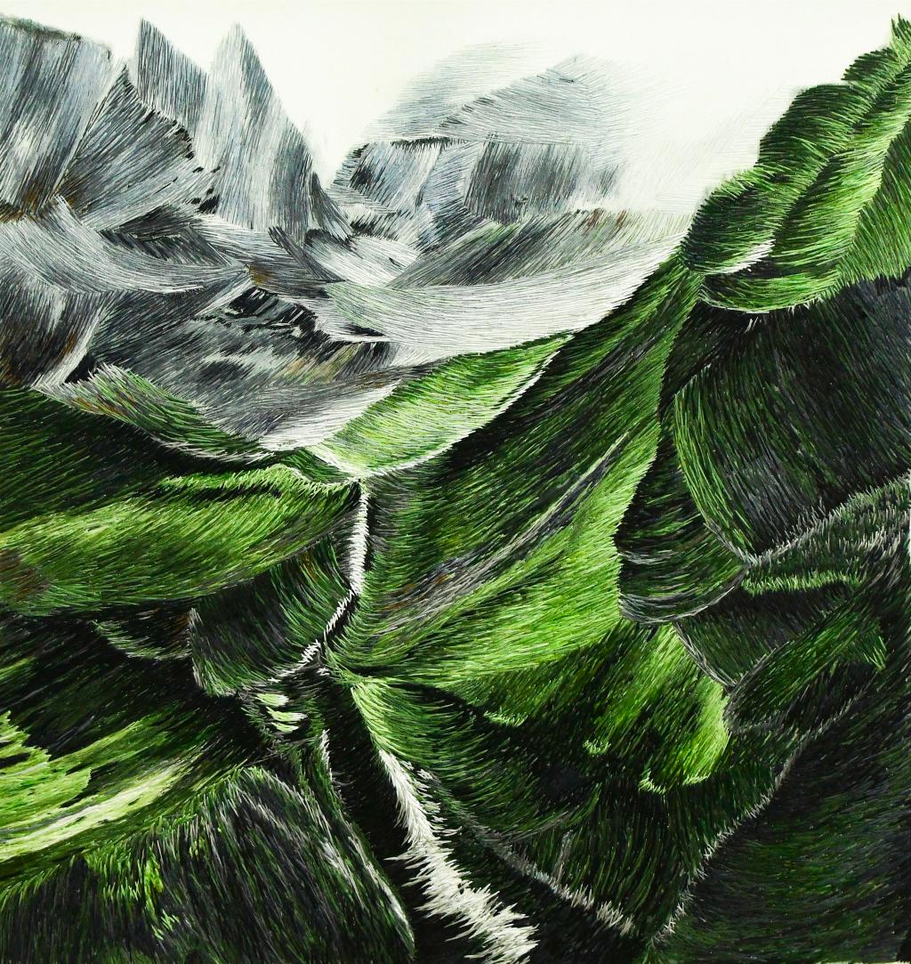 设计说明:绣品以谭智勇的原创重彩画为稿。刺绣者选用直交叉针、混针以数十种色线,分至三丝绣制,通过不同色线多层次、多色阶的相互混合,将原作色彩晕染开来的肌理效果表现出来,呈现出沉着与豪放、严谨与自由的画面效果。整幅作品色彩过渡融合自然、层次丰富多样,细节变化把握到位,加之刺绣丝线穿插的独特语言让作品产生了别具一格的独特质感。