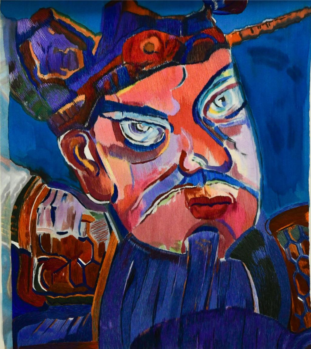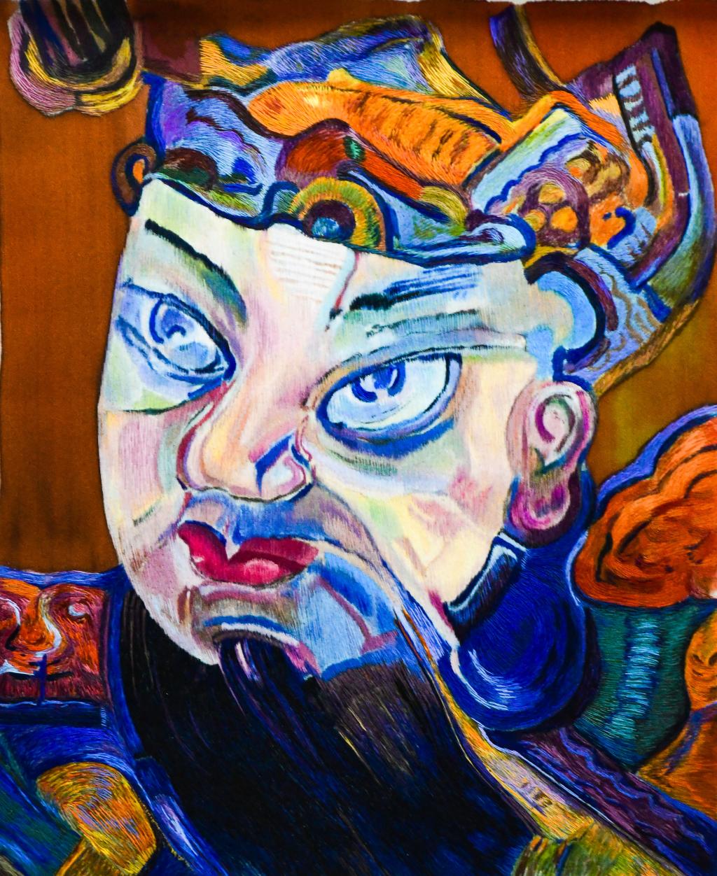 设计说明:作品以油画为题材,主题为中华传统文化中“驱邪避鬼保平安的守护神”,刺绣运用粗线铺绣、细线混合叠加的方法表现油画刚毅厚重的笔触,变化细腻丰富的色彩,使作品更灵动传神。