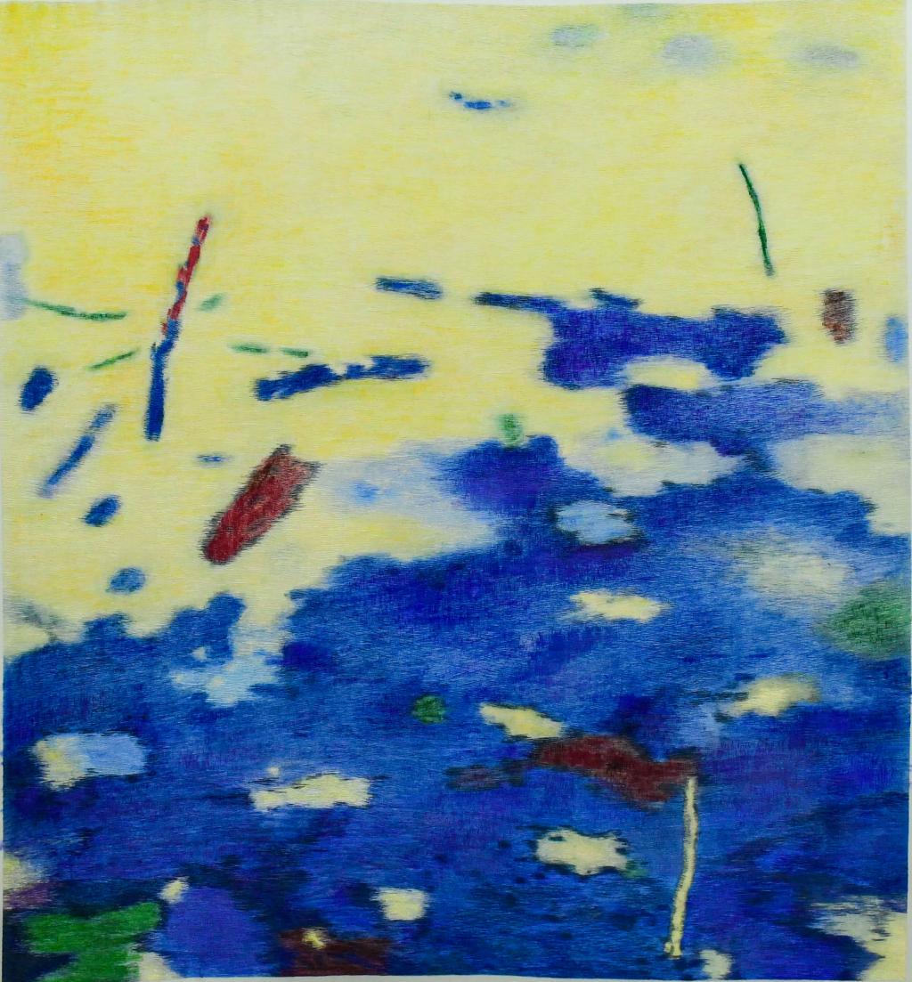 设计说明:绣品选用谭智勇的原创重彩画《色·黄》为稿,刺绣者根据画稿笔触特点采用横交叉针、斜交叉针、混针等针法结合不同纯度、明度变化的蓝、黄色线绣制,同时通过色线细腻混合和色线的自然反光,表现出原作蓝色与黄色相互碰撞的色块变化,以及极具想象空间的抽象图案变化。传统刺绣与当代抽象重彩画相结合,开阔出一种全新的视觉境界和审美要求。