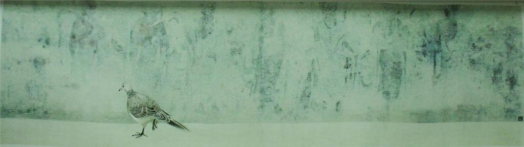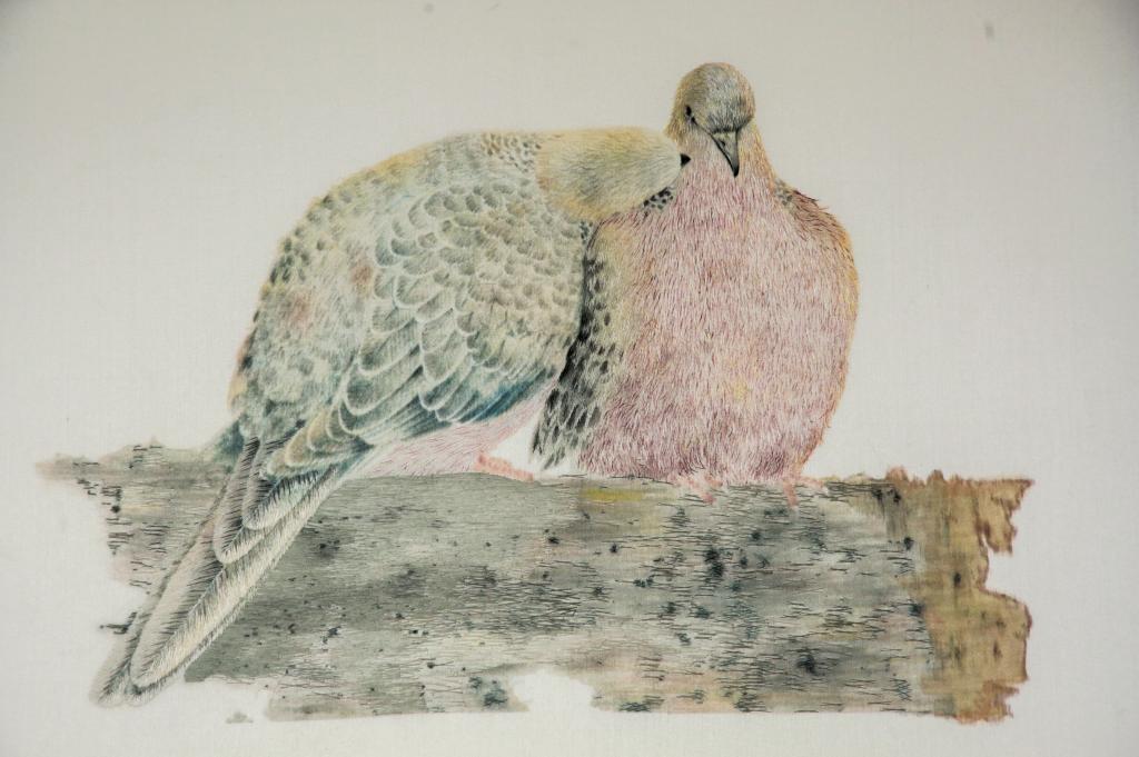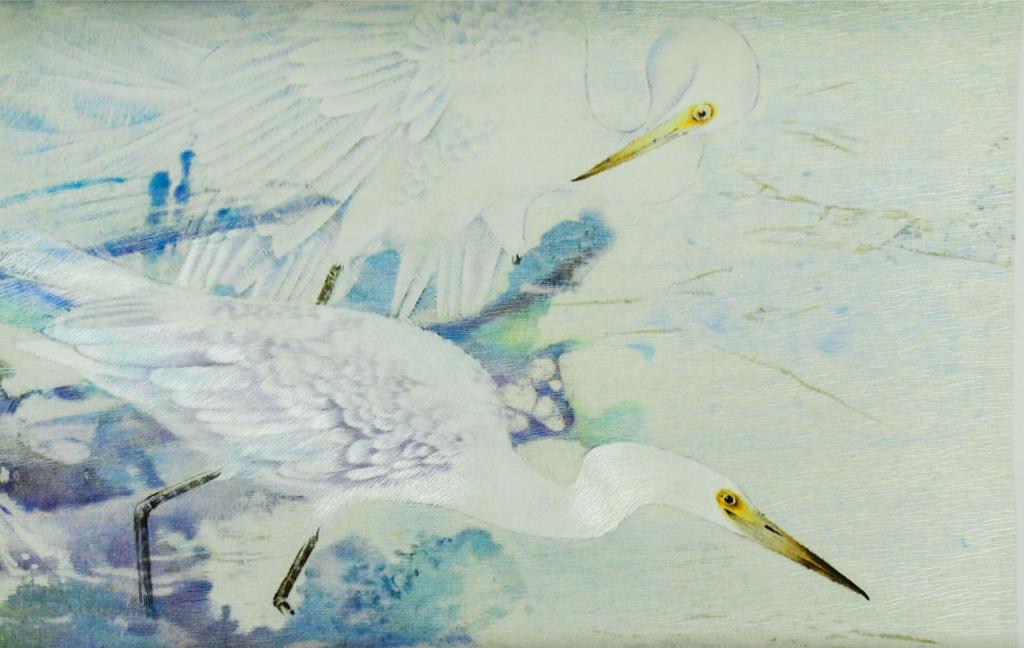 设计说明:作品选用画家姜贻华的原创作品工笔花鸟画为题材,刺绣者运用毛针掺针和游针绣制小鸟,用旋游针绣制鸟的眼睛,将生动形象的鹭鸶和斑鸠的毛绒质感表现的栩栩如生。刺绣者十分自然地把横交叉、幔针、柳针、混针和齐边针等多种针法结合起来用逐渐转变的形式绣制背景,将宁静中彰显着力量的背景视觉效果呈现的淋漓尽致。