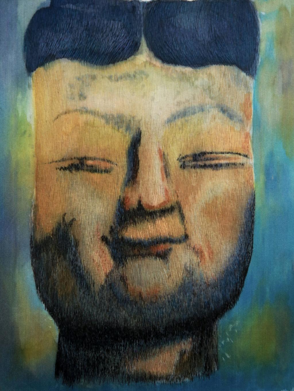 设计说明:作品以邹建平先生的原创水墨画为蓝本进行刺绣再创作。主要采用交叉针法来表现整幅作品的肌理质感,讲究粗细结合,注重冷暖对比、虚实结合,实现佛性与人性二者相互转换。将独特的刺绣语言融入佛像本身,使佛这一主题系列作品更具生命力。