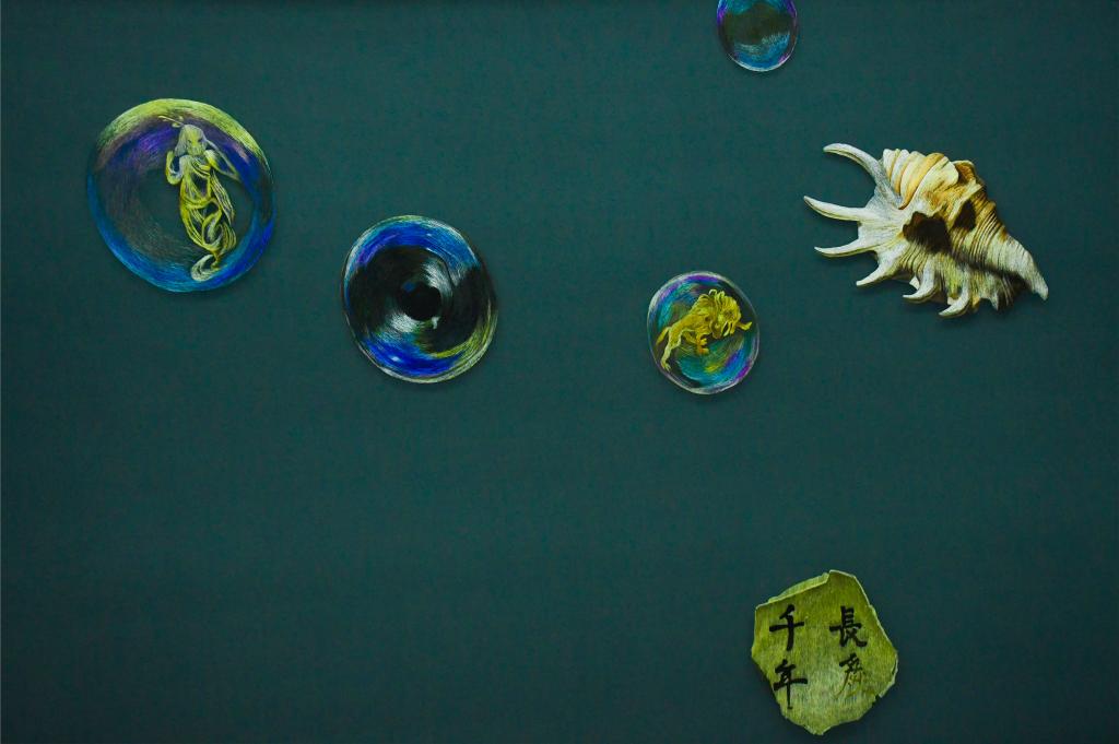 设计说明:绣稿是选自夏雪光原创设计作品《海螺》,设计思路来源于海上丝绸之路,以海螺和古代碎瓷片还有泡泡为元素,以纯黑色为背景,采用纯黑的双面绣材料来进行刺绣,利用纯色背景来突出主体,用白色中国画颜料进行绘制,再用细腻古老的手工湘绣制作,重现了文物沉入海底千年模样。传达出中国五千年文化和经济的繁荣昌盛,仿佛时光的齿轮在眼前缓缓转动。
