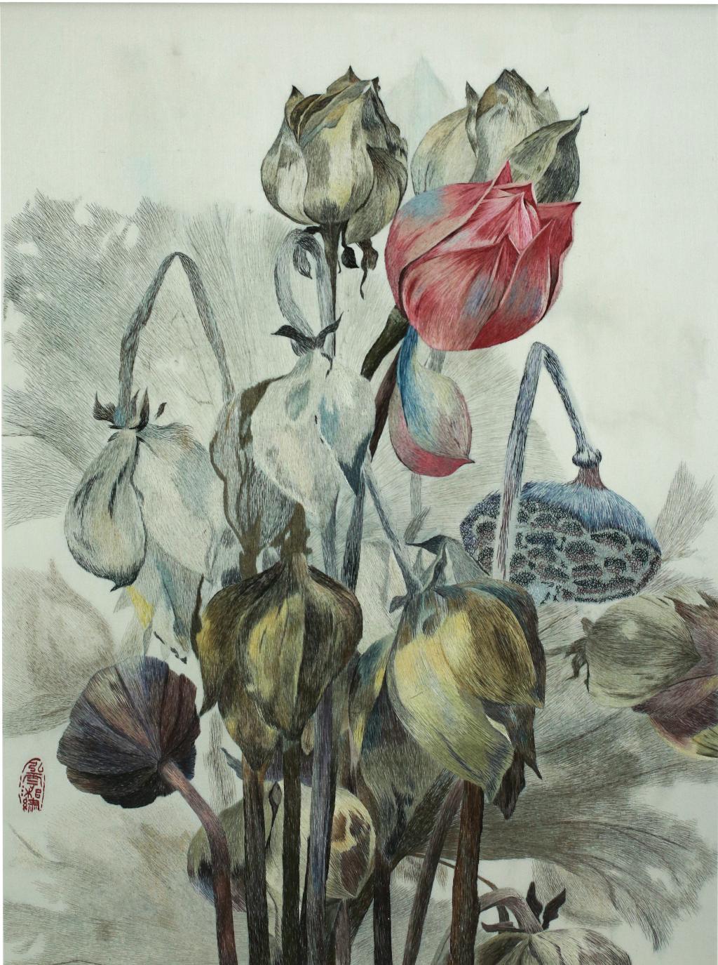 设计说明:作品以重彩画为题材,主要运用湘绣传统针法竖交叉针、掺针、混针等针法结合多层次、多色阶的丝线绣制,通过色线的粗细变化和丝线的自然反光,层层施绣,将画面的肌理渲染效果和丰富的色彩变化,逐一表现勾画出花苞的立体感,使整幅作品色彩过渡融合,自然,细节变化把握到位,使作品充满无限生机。