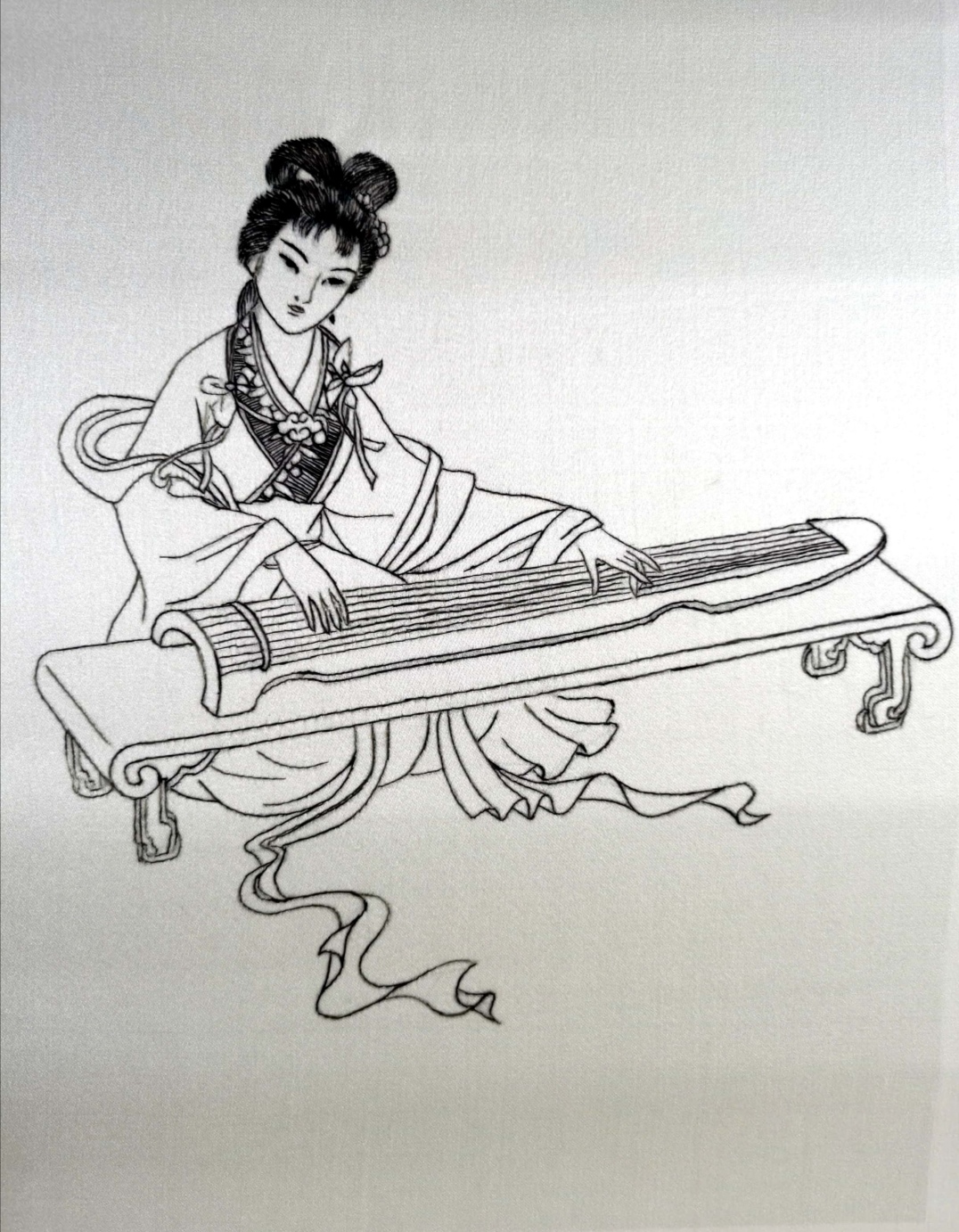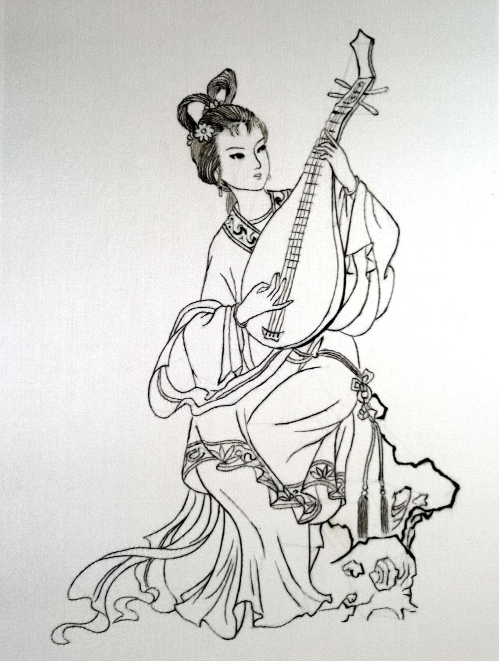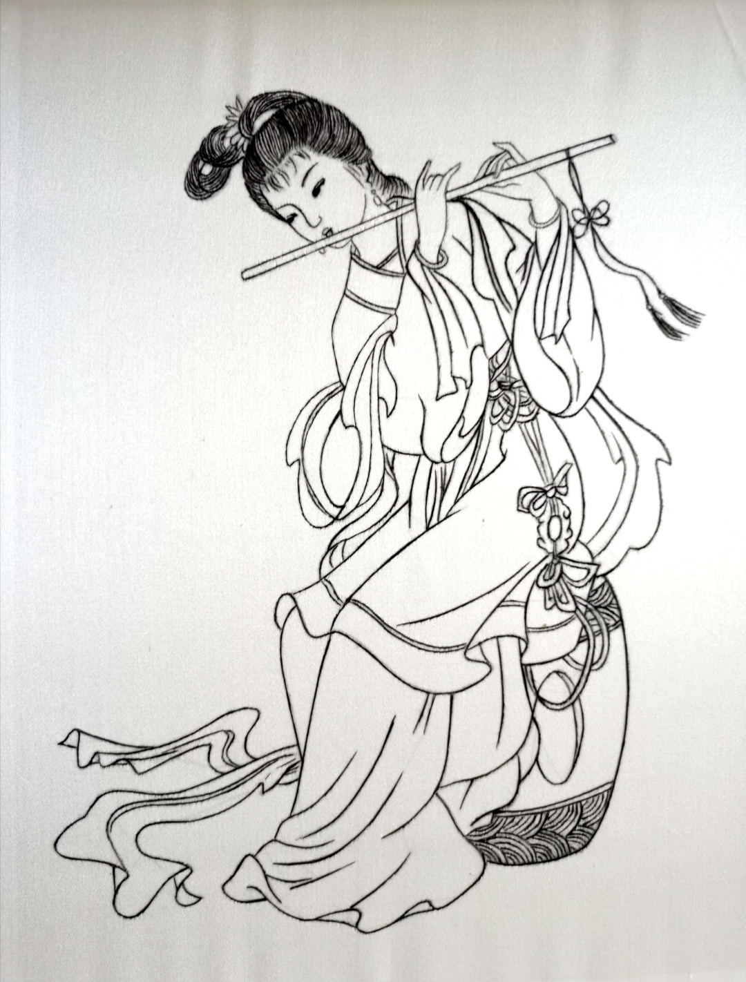 设计说明:作品以工笔画为题材,选取湘绣多种针法精准刺绣,呈现出十种不同风格地舞乐仕女演奏乐器的仪态。十幅作品层次分明、人物神态活灵活现。寓意吉祥、美好,表达了人们对安稳生活的向往。