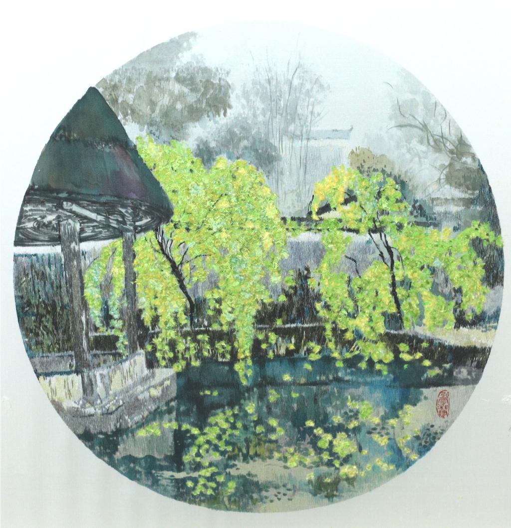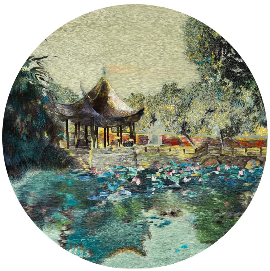 设计说明:作品以油画风景为题材,根据油画的特点采用交叉针、乱针等混合绣制,结合丝线的粗细和色阶的变化,将画面中江南园林的特色和油画颜料堆积的肌理效果很好的表现出来,让人透过作品感受到江南园林的温婉风情。