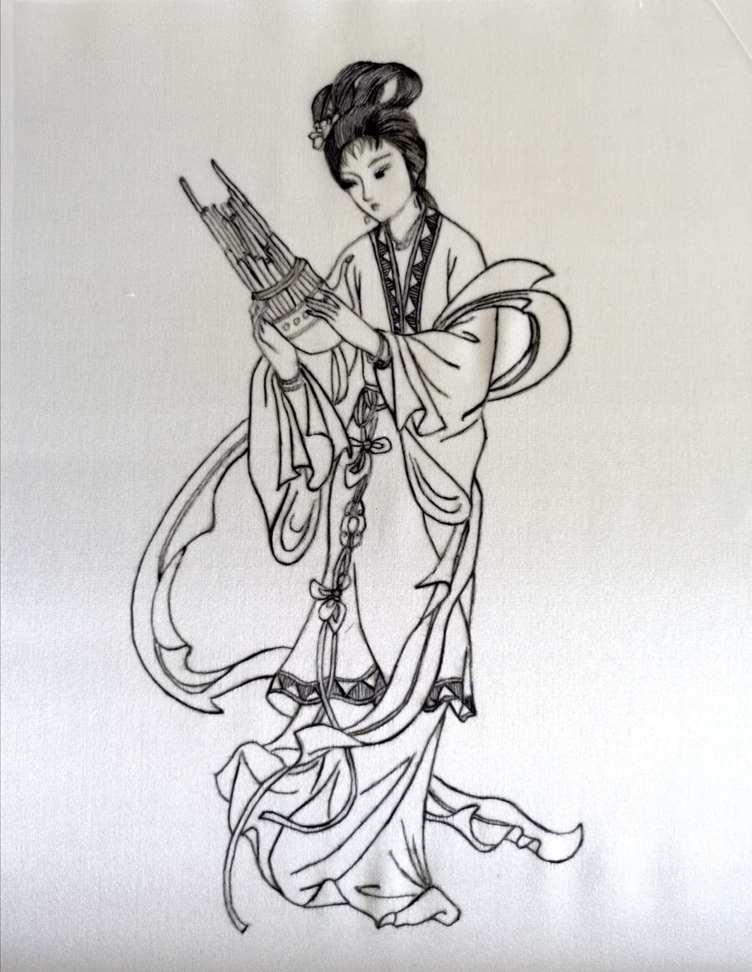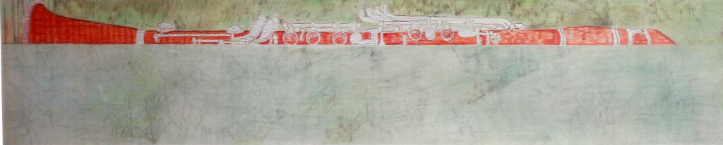 设计说明:绣稿以工笔画为题材,这幅作品的题材与以往传统工笔画题材不同,突破了花鸟人物,选取了极为新鲜的题材:乐器——单簧管。这种西洋乐器与中国传统工笔画结合,竟也不显得突兀,画面赏心悦目,别具一番风味。通过使用一套颜色不同色系的绣线来表现,给人一种细腻妥帖的感觉,使作品的表现力极具丰富情感和情境表达能力。