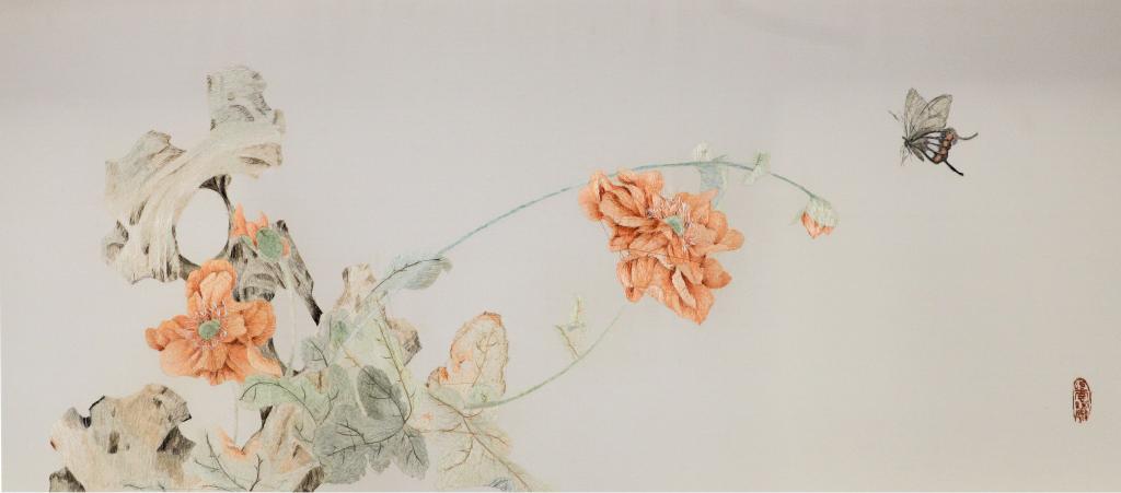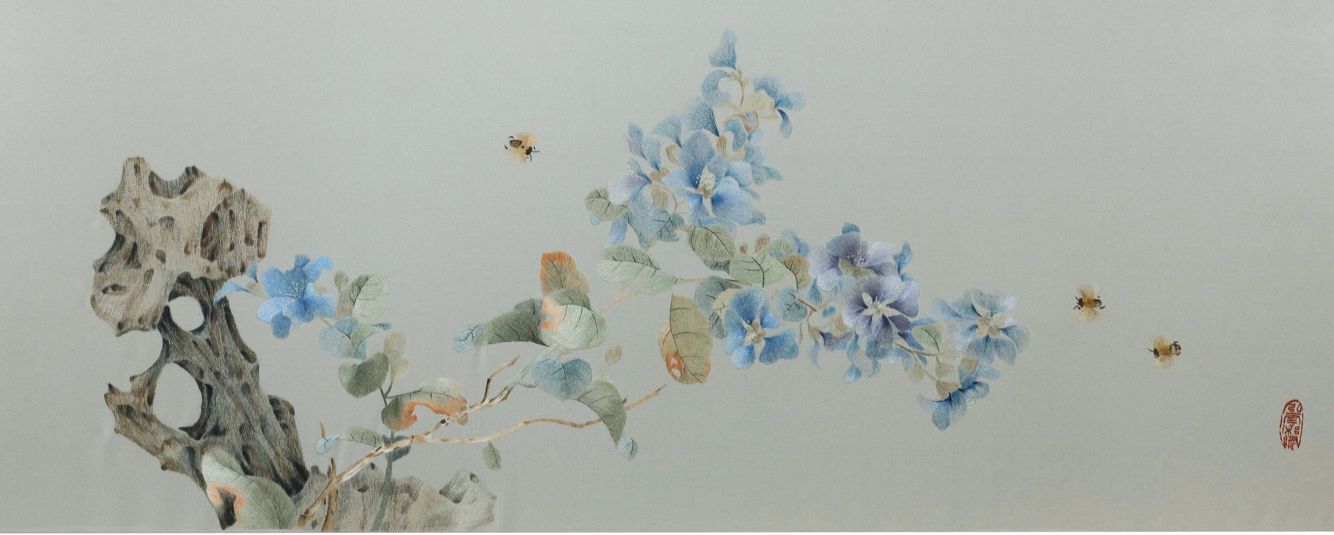 设计说明:绣稿为中国传统没骨画,作品用色素淡雅致,构图严谨,图中的花卉与太湖石相辅相成。刺绣者采用湘绣传统掺针与交叉针相结合,对画面进行精细刻画,使画面生动逼真、活色生香。