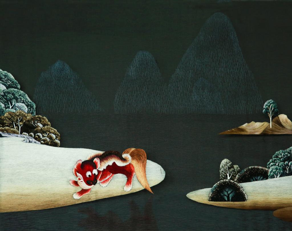 设计说明:作品以我院吴俊老师的原创作品为绣稿,地域特征极强。画面中岸边的貔貅采用湘绣独有的鬅毛针法以写实的手法绣制,而水中的倒影则用幔针绣制,一实一虚相映成趣,使画面更具灵气,虚实效果强烈。