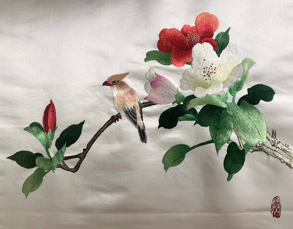 设计说明:作品以工笔画为题材,灵活运用湘绣中的毛针、游针和混针进行层层叠加绣制,分别展现了鲜艳的花朵,活泼的小鸟。绣品细节充实、饱满,色彩过渡细腻,刺绣工艺为画面增添了更传神的光泽,使作品更加打动人心。