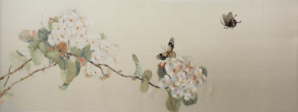 设计说明:作品以工笔画类为题材,构图饱满,颜色清新淡雅,刺绣者巧妙的运用了掺针、齐边针、混针等多种针法结合多色阶的丝线绣制,通过色阶的细腻混合,刻画了绣球花、枝叶的素雅,表现了花瓣的多层次变化,凸显了立体感。整幅作品细节精准到位,色彩过渡自然、融合,展现了作品的清新雅致与刺绣工艺的精致细腻。