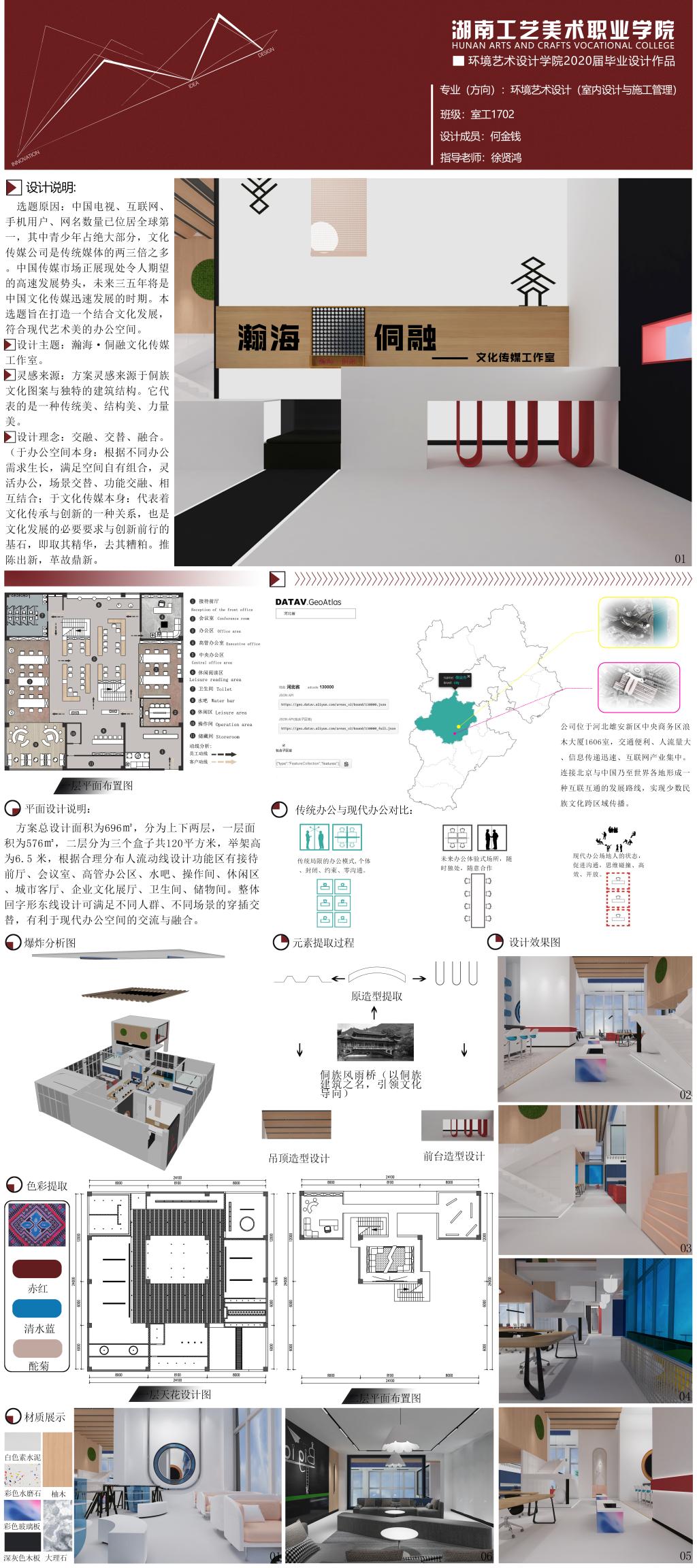 本案是对侗族服饰文化的传承,通过设计团队独具慧眼的精心设计,在这个平凡的“工作室”中尽展新姿。侗锦其工艺之精细、色彩之艳丽、图案之美观、民族特色之浓郁,可谓巧夺天工。方案将侗锦作为构建室内空间的主要元素,因地制宜、实事求是地对非遗传统文化进行了二次创新演绎,通过对侗锦多种手法的运用,使工作室环境丰富多彩、主题鲜明、寓意隽永!