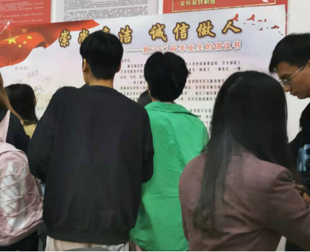 讲座结束后,开展了廉洁承诺签名活动,同学们递交了廉洁承诺倡议书,并在廉洁承诺墙上签名。同学们纷纷表示,此次活动很有意义,不仅加深了对百年党史和廉洁从业的理解,也增强了自身的防腐拒变意识,今后一定要学史力行、学法守法,不断加强自身建设,筑牢廉洁自律的思想防线。
