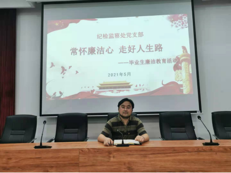 5月20日,纪检监察处党支部举行廉洁从业教育专题讲座,支部书记邱学文作题为《常怀廉洁心走好人生路》的专题讲座。邱书记从毕业生就业方向的现场调查开始,从党史学习教育的重要意义切入,详细讲解了中国共产党光辉的奋斗历程,生动讲述了建党百年以来各个时期涌现的伟大人物、伟大事迹,最后结合学习、工作实际阐述了党史学习教育的目标要求和廉洁从业的具体要求。他强调,走好人生的方向,脚下第一步很重要。走向社会后,我们时时刻刻都处于监督之下,要适应监督和制约的社会环境,毕业后要适应监督、认清当下时代的潮流、要有底线意识、公私分明,要从百年党史中汲取廉洁从业的精神力量。