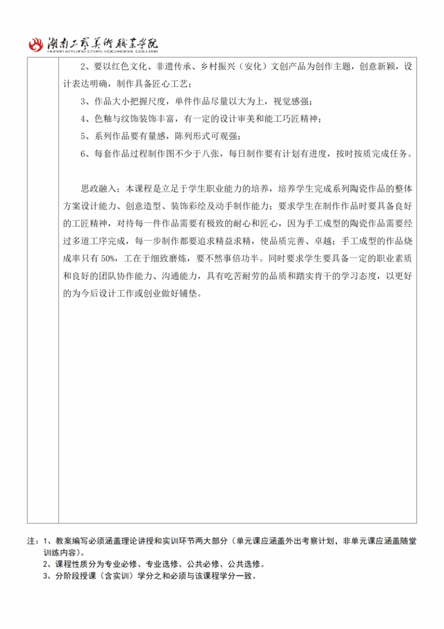 湘绣艺术设计学院提交授课计划7份。均格式规范,内容较完整,教学设计较合理,语句通顺,思政教育融入课堂较突出、自然,考核办法较明确具体。但有部分授课计划没有教师和工学部主任签名认可。