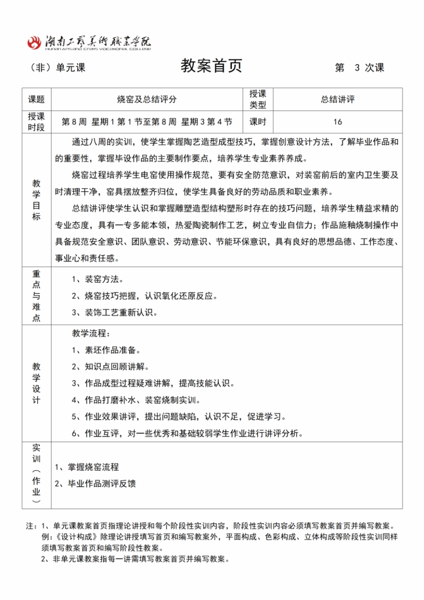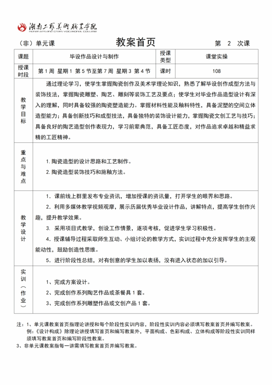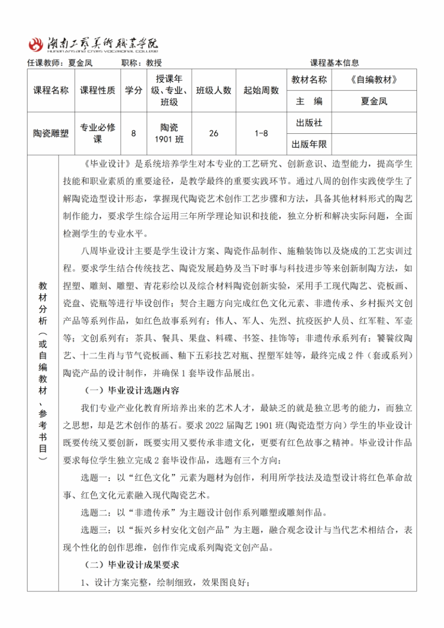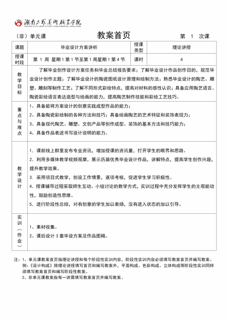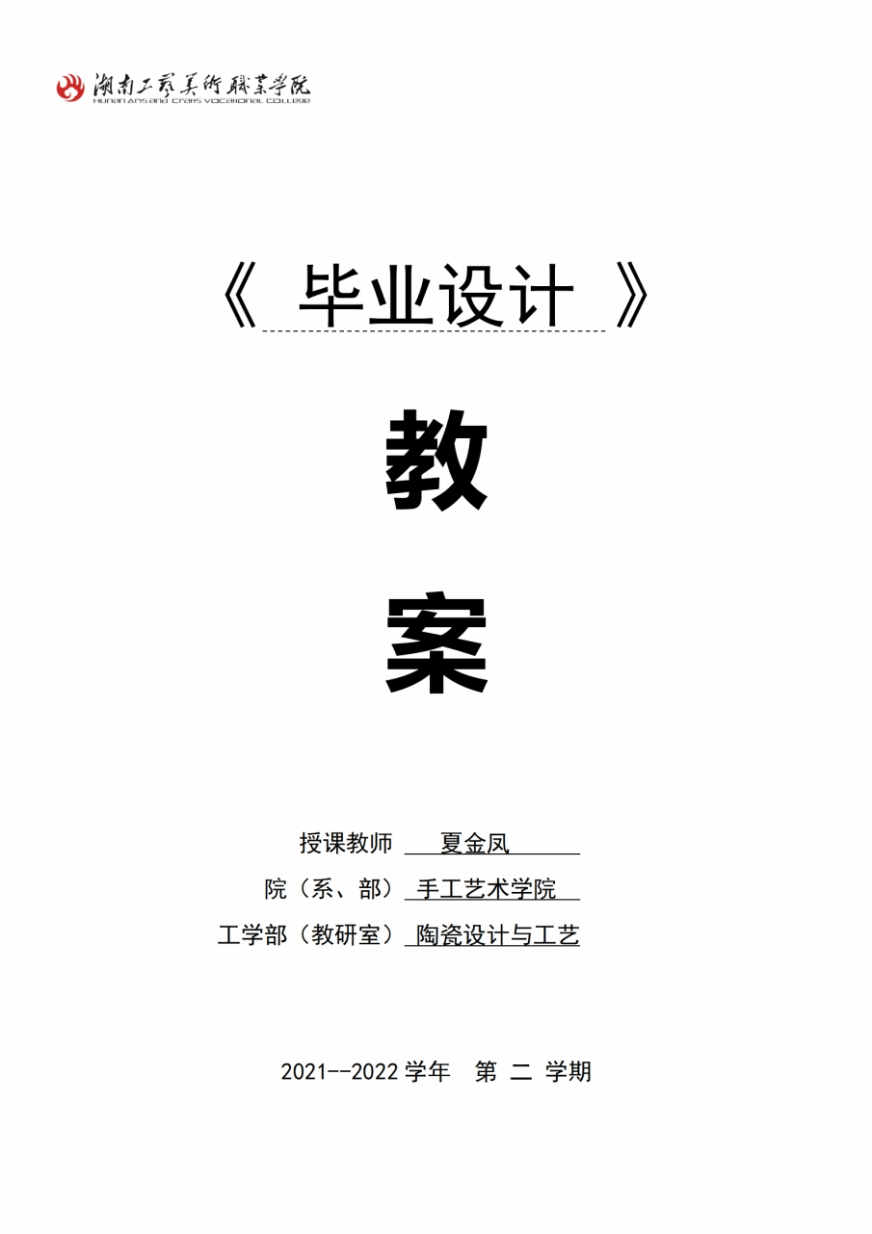 在教学检查中我们发现,部分老师对《毕业设计》教案无从着手,有的学院甚至无法提交,大部分提交了的也难尽人意。但是,手工艺术设计学院的夏金凤和数字艺术设计学院的莫舸等老师的《毕业设计》教案的撰写阅后令人眼前一亮,内容与形式相对统一,层次清晰,目标任务明确,有较强的操作性。由于篇幅有限,现将夏金凤老师《毕业设计》教案分享给大家,供大家学习借鉴。
