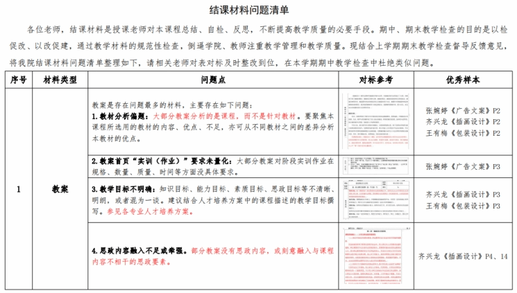 全校八院一部教学常规材料整体材料齐全,自查基本到位,整改显著,进步明显。公共课部欧阳浩洪课程总结写得较好,接地气。体育教研室、大学生成长教研室、人文通识教研室、英语教研室考勤认真;环艺学院丁宇、刘檬、欧阳轶夫讲评总结到位,针对性强。大部分老师考勤认真,成绩分布合理;服装学院资料整理细致,易慎、彭荟、卿源、张继荣、廖秀、伍佳欣等老师提交的资料规范,合乎要求;视传学院刘若根、曾琦、崔伟鹏、李丹骏学生考勤详实,成绩评分准确,课程总结到位,讲评提纲针对性强;数字学院工作思路清晰,有实干精神,执行力强。陈伟、周瑶瑶、肖惠文、舒楚天、蒋姝宁、李玲婷、余果、何颖琦等老师教学资料撰写针对性强,且接地气,进步幅度大;手工学院自查认真,彭淋莹、唐慧萍做得较好;湘绣学院整体质量较高,肖念讲评提纲优劣作业凸显,且客观公正;马克思学院集体备课,互相听课落到实处,效果明显。周哲、李满英学生考勤认真详实、成绩评定客观公正;双创学院匡晓华、李清良、谢志杰教学材料撰写认真,针对性强。