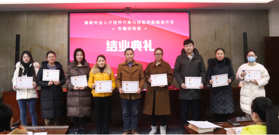 结业典礼上,陈祉音从学校重视组织协调到位、理实结合课程设置到位、专家大师授课教学效果显著、专注认真学习氛围浓厚、客观公正综合考评到位等五个方面对本次培训进行了全面总结。学员代表黎波汇报了培训学习感受和成果,本次培训班组织科学有力,管理严谨温暖,全体学员认真聆听专家学者讲学,深入研讨切磋,受益匪浅,在人才培养方案调研方法、模块化课程体系建构、人才培养方案诊改、专业技能考核标准和题库开发等多方面均有显著提升。后续工作中将进一步明确自身工作任务和职责,从诊断和改进入手提升专业人才培养方案和技能抽查标准开发工作水平,提高自身教学能力,为本校专业建设和服务地方区域经济社会发展贡献自己的力量。随后,李虹霞宣读了优秀学员表彰文件,共有十名教师获“优秀学员”称号。刘英武为参培学员颁发结业证书,并与学员合影留念。