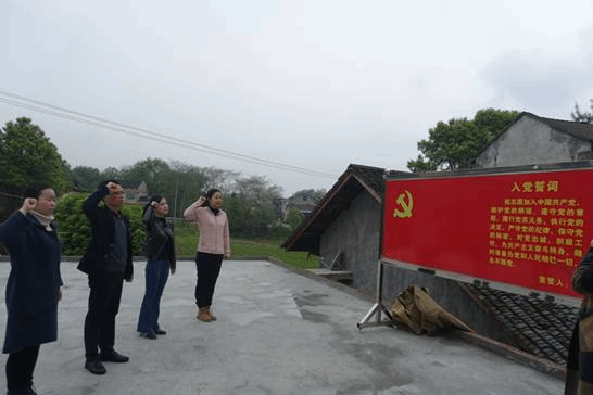 参观陈列馆之后,在马迹塘战史陈列馆广场,支部党员面向党旗,高举右手,重温入党誓词。
