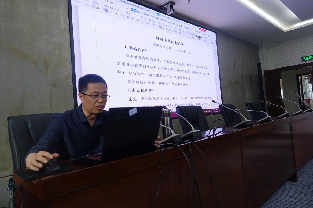 在学校党委开展党史学习教育以来,科研处党支部不断创新学习方式,提升学习效果。在切实完成学校党委安排的各项学习任务的基础上,创新推出 “党史朗读会”“党史小故事”等专题,并在科研处网站基层党建栏目建立相应专栏。结合部门的工作内容,科研处党支部将“我为群众办实事”落到实处。6月1日下午,针对学校不断有老师向科研处咨询关于科研成果等相关事宜,为科学合理解答老师们的疑问,科研处党支部在致美楼206会议室举行“我为群众办实事”实践活动科研宣讲会。科研处支部书记刘光平作科研成果专题宣讲。学校学生处、后勤处、校企合作处、财务处等部门的老师一起聆听了宣讲。