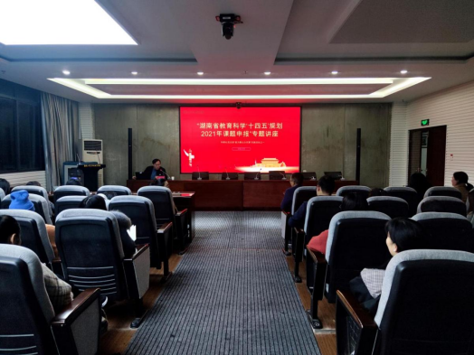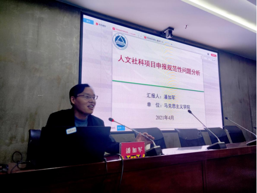 为进一步提高学校教师科研能力,4月8日晚上19:30,在学校致美楼206会议室举办湖南省教育科学"十四五"规划2021年课题申报指导专题讲座。此次讲座由江南大学马克思主义学院副院长潘加军博士主讲。学校副校长夏能权亲临会议现场,各学院教师代表100余人现场聆听,科研处处长刘光平主持讲座。