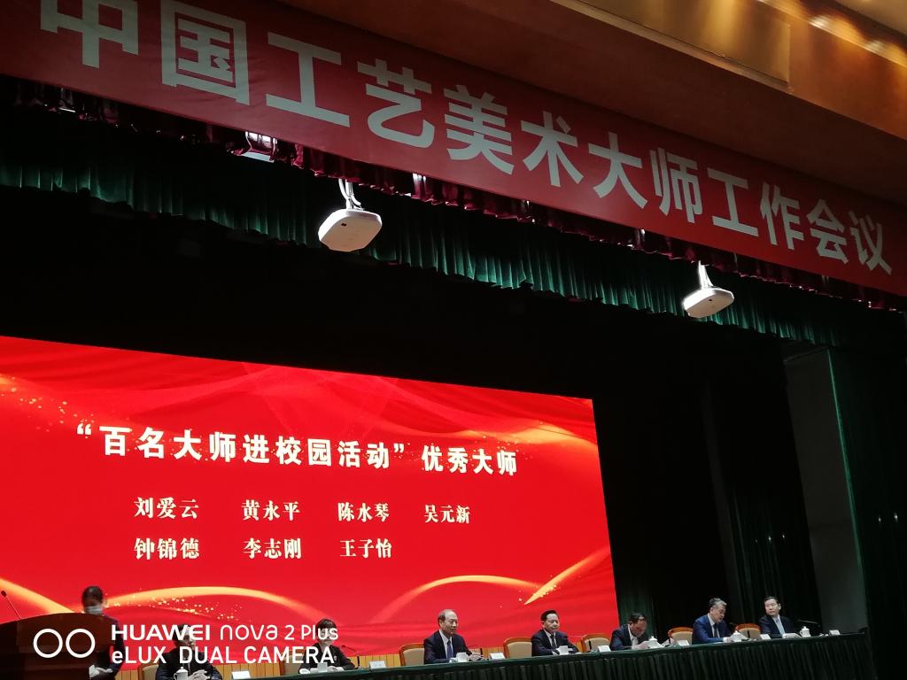会上,表彰了3所“百名大师进校园活动”优秀基地院校,学校是其中之一,“百名大师进校园活动”优秀基地院校从2019年立项的首批26所中国工艺美术大师传承创新基地院校中评选。表彰了7名“百名大师进校园活动”优秀大师,学校聘请的刘爱云、黄永平2名大师受奖,“百名大师进校园活动”优秀大师从2019年入选的首批41名院校合作大师中评选。