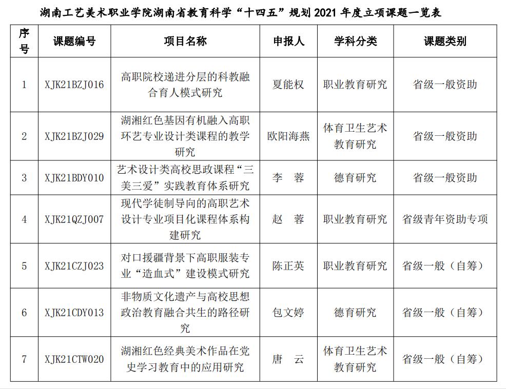 我校共有7项课题获得立项,其中夏能权老师主持的《高职院校递进分层的科教融合育人模式研究》、欧阳海燕老师主持的《湖湘红色基因有机融入高职环艺专业设计类课程的教学研究》、李蓉老师主持的《艺术设计类高校思政课程“三美三爱”实践教育体系研究》立项为一般资助课题,赵蓉老师主持的《现代学徒制导向的高职艺术设计专业项目化课程体系构建研究》立项为省级青年资助专项课题,陈正英老师主持的《对口援疆背景下高职服装专业“造血式”建设模式研究》、包文婷老师主持的《非物质文化遗产与高校思想政治教育融合共生的路径研究》、唐云老师主持的《湖湘红色经典美术作品在党史学习教育中的应用研究》均立项为一般课题。