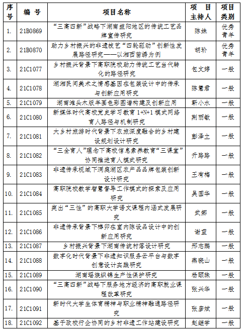 12月15日,湖南省教育厅下发《关于公布2021年湖南省教育厅科学研究项目立项结果的通知》,我校共有18项课题获得立项,其中陈姝老师主持的《“三高四新”战略下湖南益阳地区的传统工艺品牌宣传研究》、胡玠老师主持的《助力乡村振兴的非遗技艺“四轮驱动”创新性发展路径研究——以湘西苗绣为例》立项为优秀青年项目,其他16项课题立项为一般项目。