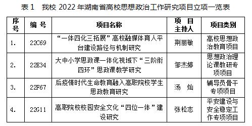 9月2日,湖南省教育厅下发《关于2022年全省高校思想政治工作研究项目立项的通知》,我校共有4项课题获得立项,其中荆丽敏老师主持的《“一体四化三拓展”高校融媒体育人平台建设路径与机制研究》立项为高校思想政治教育项目、邹杰婷老师主持的《大中小学思政课一体化视域下“三阶衔四环”思政课教学研究》立项为思想政治理论课教研专项项目、汤灿老师主持的《后疫情时代生命教育融入高职院校学生思政教育研究》立项为辅导员骨干专项项目、张松志老师主持的《高职院校校园安全文化“四位一体”建设研究》立项为平安建设与安全稳定工作专项项目。立项名单见表1。