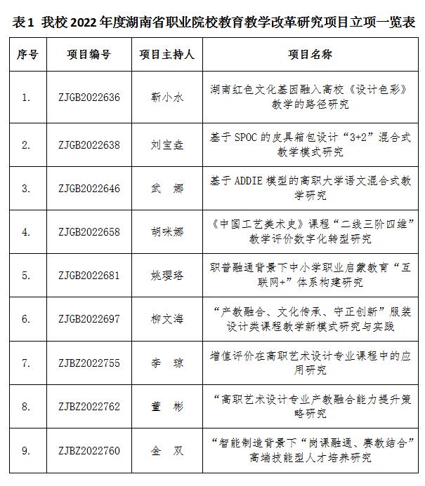 近日,从湖南省教育厅获悉,《关于公布2022年湖南省职业院校教育教学改革研究项目立项名单的通知》(湘教通〔2023〕144号)正式下发,我校申报的《湖南红色文化基因融入高校<设计色彩>教学的路径研究》等9项课题获得立项。立项名单如表1。