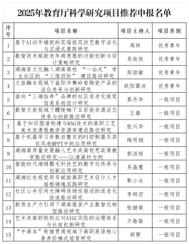 根据湖南省教育厅《关于申报2025年度湖南省教育厅科学研究项目的通知》文件精神和学校要求,本次共申报33项课题,经科研处形式审查,校内外专家匿名评审,根据专家评审结果,现将2025年湖南省教育厅科学研究项目校内推荐评审结果公示如下: