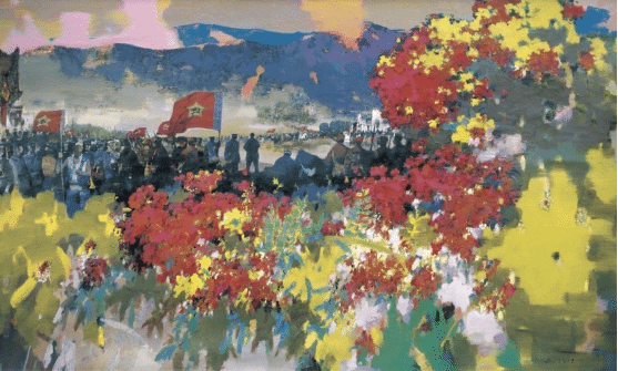湘籍画家陈和西以井冈山会师为主题,创作了油画《岭上开遍映山红》。