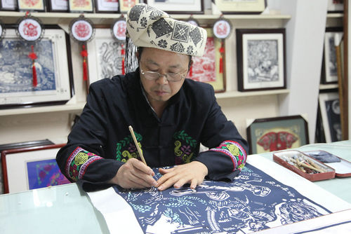 踏虎凿花剪纸《雪峰战魂》的作者——李铁骑,男,1962年生,苗族,湘西土家族苗族自治州泸溪县人,湖南省剪纸研究会会员,泸溪县踏虎凿花传习所原所长。主要从事踏虎凿花传承、创作与保护研究工作。
