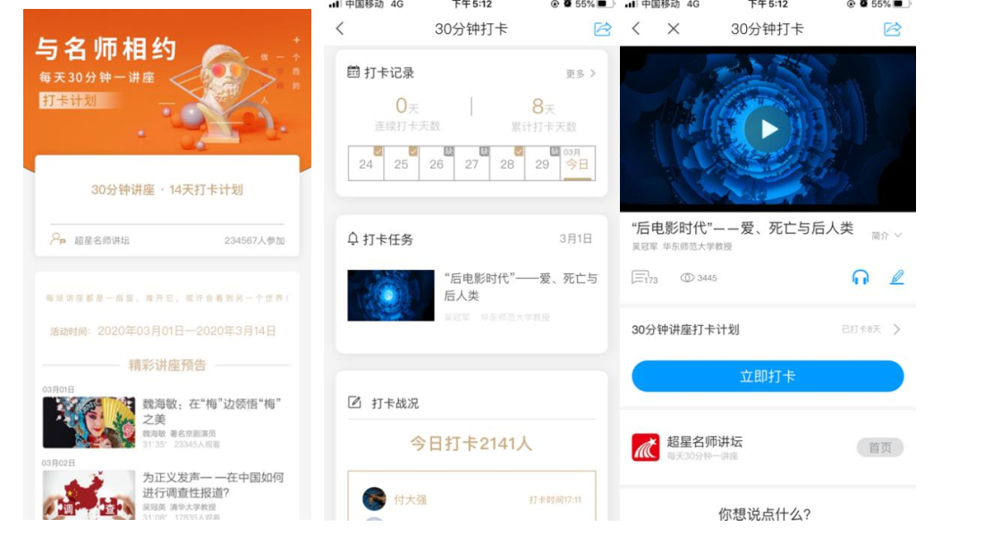 活动期间,每天推出一个优质学术视频,师生观看并打卡。打卡内容来自超星名师讲坛每天 30 分钟一讲座,部分视频内容展示如下: