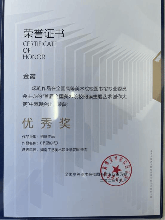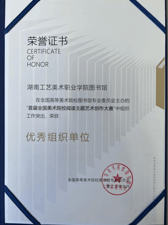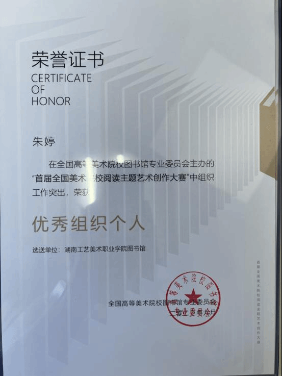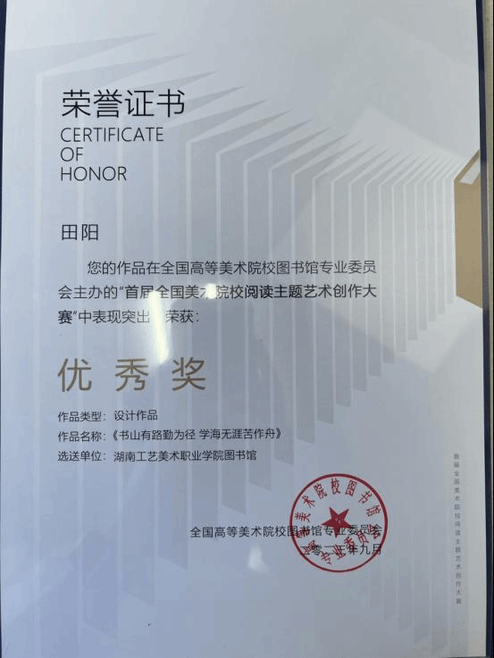 首届全国美术院校阅读主题艺术创作大赛公布大赛结果,我校金霞、田阳同学荣获优秀奖,图书馆荣获优秀组织单位,朱婷老师荣获优秀组织个人。