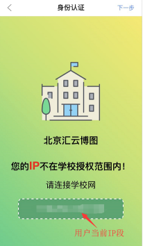 若为校园网IP,则点击右上角下一步进行注册;若不为校园网IP,则无法验证通过,需要用户连接校园网后再注册。