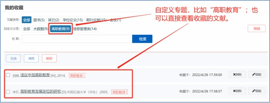 用户对不同类型的文献进行收藏后,资源可自行分类保存到“个人中心”,可随时进行查看、浏览、原文获取。