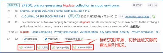 经纶对文献的数据来源进行过标引,标识出文献是否来源于中文核心、SCI、EI、Springer、EBSCO。点击来源链接,跳转到来源网站的详情页面,可以初步验证某篇文章的查收查引情况。