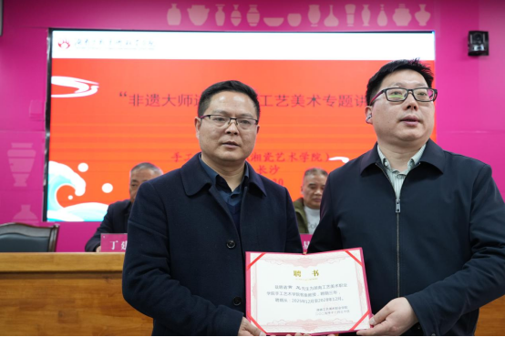 2025年12月30日,手工艺术学院在长沙基地综合办三楼学术报告厅成功举办了“非遗大师进校园”系列讲座。本次活动特邀陶瓷行业企业的四位杰出代表——易龙华、黄龙、宋华青、丁建国大师,为学院师生带来了一场精彩的学术盛宴。讲座由手工艺术学院副院长王飞主持,学院百余名师生共同参与。讲座伊始,王飞副院长为三位陶瓷艺术大师隆重颁发了客座教授聘任证书。他们分别是:中国工艺美术大师易龙华、湖南省非物质文化遗产“醴陵釉下五彩瓷烧制技艺”...