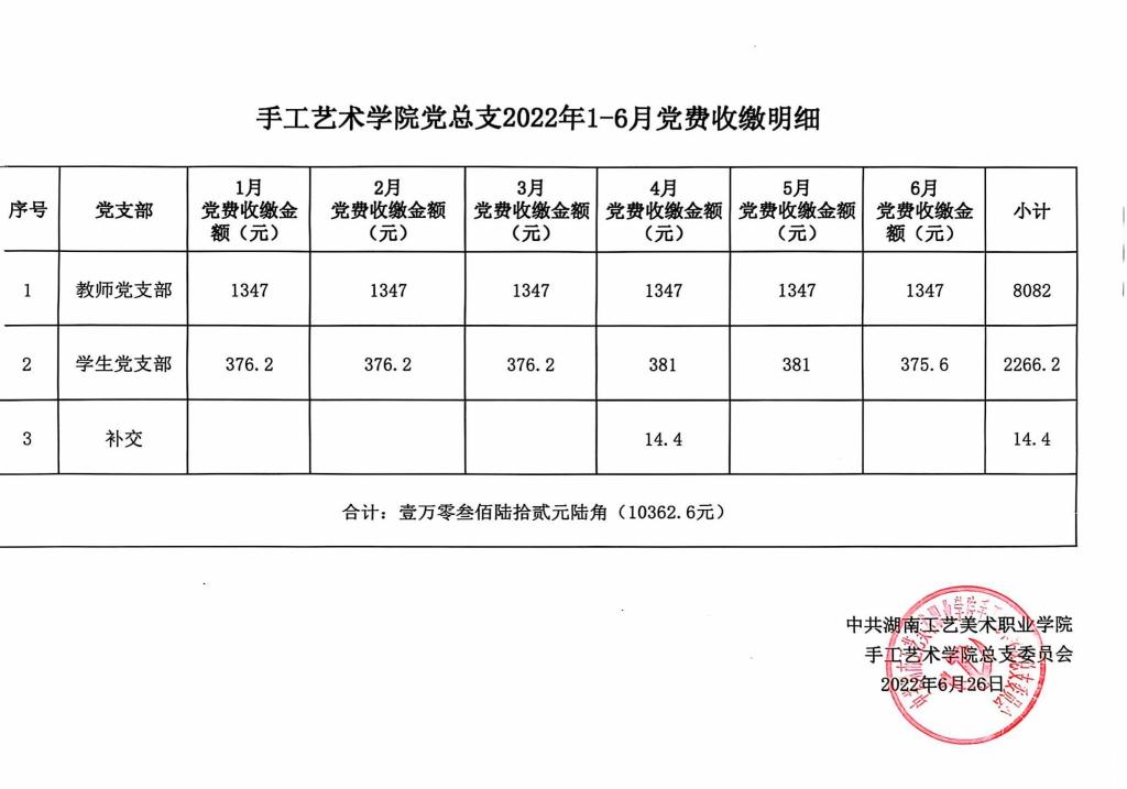 手工艺术学院党总支2022年1-6月党费收缴明细公示