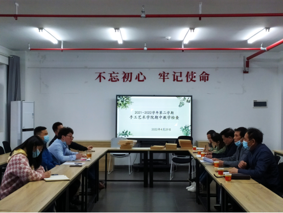 手工艺术学院王飞副院长首先向教务处督导室汇报了期中教学检查的基本情况,指出了亮点以及存在的不足。然后督导教授进行了现场资料的查看并提出了反馈的意见,对我院的教学管理工作提出了肯定和表扬,特别是在新冠疫情期防控期间,克服各种困难,严抓教学管理,保证的正常的教学秩序,按长沙县防控办要求部分外聘教师授课采取线上教学的方式,教案、教学总结、讲评提纲、考勤表、成绩评定表等各项结课资料上交及时,课程融入课程思政、劳动教育等内容。同时指出普遍存在的同头课雷同等不足,还从教材分析、教学目标、课程思政、实训安排操作性等四个方面提出了建议。