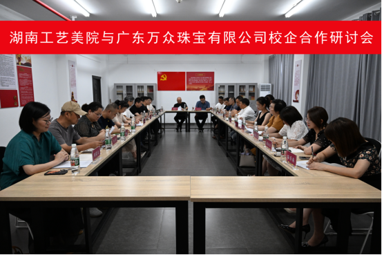 2022年8月6日,晴空万里,艳阳高照,我校与广东万众珠宝首饰有限公司校企合作研讨会在长沙基地举行,学校党委书记陈鸿俊、校长夏能权、副校长刘英武、万众珠宝公司董事长何阳华出席会议并作重要讲话,手工艺术学院领导及专业教师参会,会议由手工艺术学院党总支书记刘亮主持。