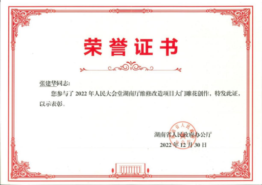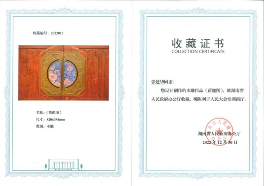 说起这份荣誉,时间要回到2022年6月。张建华应湖南省人民政府办公厅邀请,参与人民大会堂湖南厅维修改造项目,精心设计创作了大门雕花作品《荷趣图》。为了表彰张建华的辛勤付出,湖南省人民政府办公厅特此为张建华大师颁发了荣誉证书和收藏证书,作品《荷趣图》被湖南省人民政府办公厅收藏,现陈列于人民大会堂湖南厅。