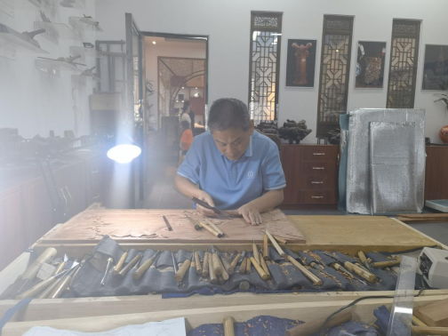 走进人民大会堂湖南厅,映入眼帘的就是张建华的大门雕花作品《荷趣图》。作品以大果紫檀为材质,以寓意和谐高洁的荷花为主题。所刻荷叶具备正、侧、俯、仰、卷、舒各种姿态,极尽变化,匠心独具。作品中青蛙、蜻蜓和小鱼嬉戏游玩,动静结合、意境生动。《荷趣图》营造出一片“妙趣横生、生机盎然”的自然景象,描绘了一幅“生态宜居、和谐共生”的祥和画卷。